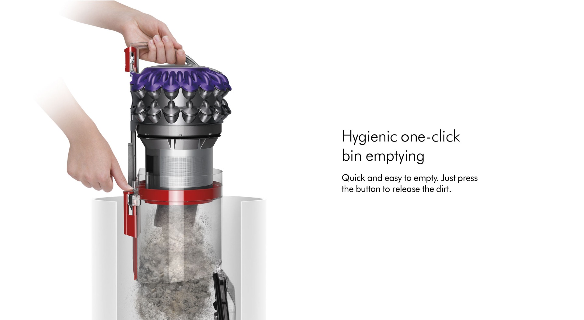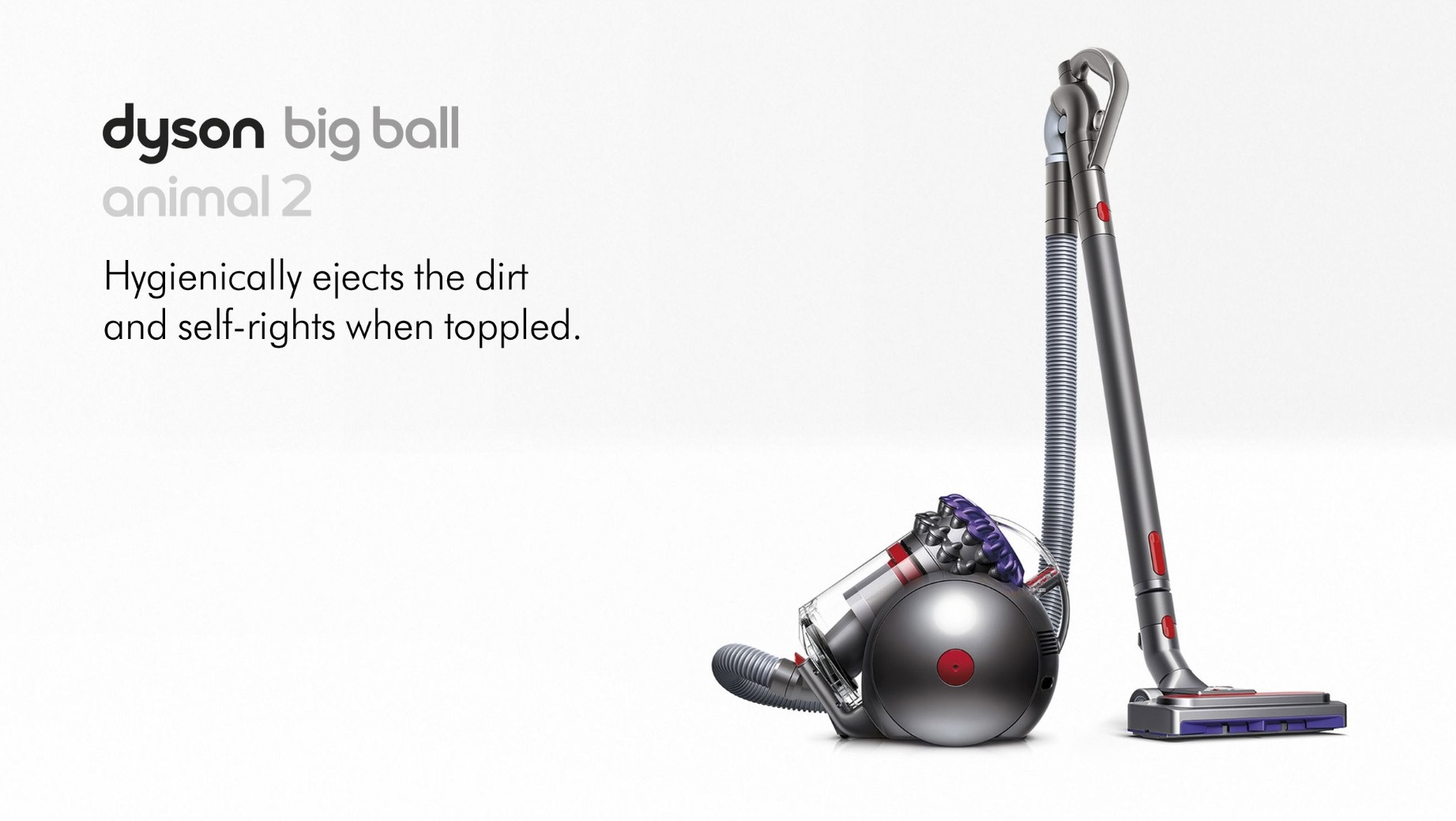 Dyson Big Ball Animal 2 cylinder vacuum deep cleans the entire home with minimal effort. It self-rights when toppled and hygienically ejects the dirt from its bin, with no need to touch it. The Dyson pneumatic cleaner head self-adjusts to seal in suction on all floor types and a rotating wand handle enables effortless, versatile cleaning.
